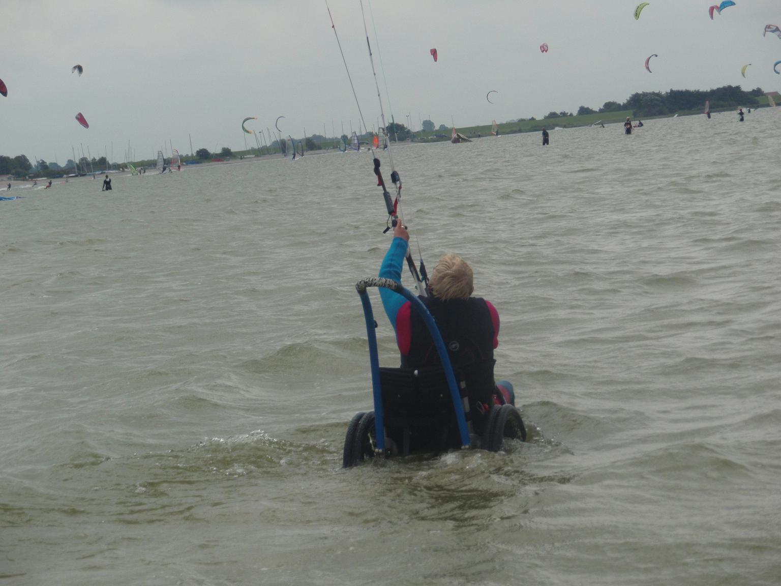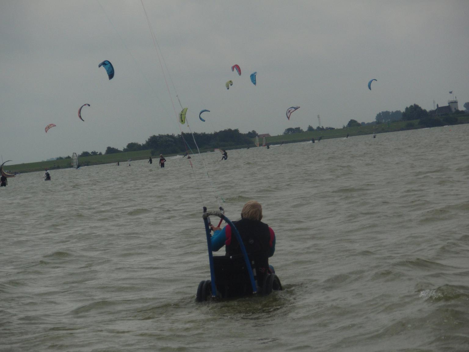 Op dit moment heb ik de kite onder controle in mijn strandrolstoel dus ga ik